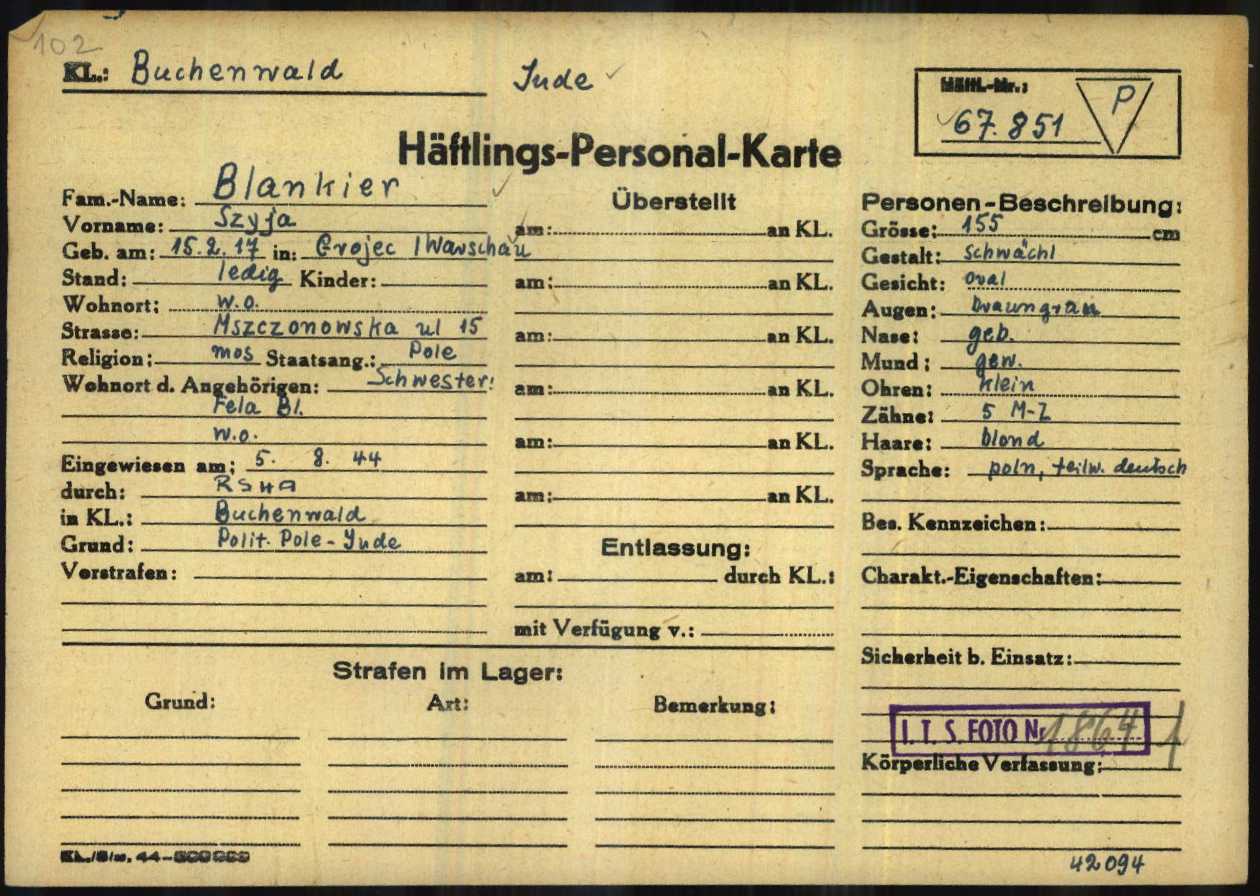 Als ich im Ghetto Warschau war, traf ich dort im Oktober 1941 Herrm Szyja Blankier, geboren am 15.5.1922 in Groek, Polen [...] Wir verrichteten dort zusammen verschiedene Zwangsarbeiten. Wir blieben dort zusammen bis Oktober 1942, dann verlor ich ihn aus den Augen.