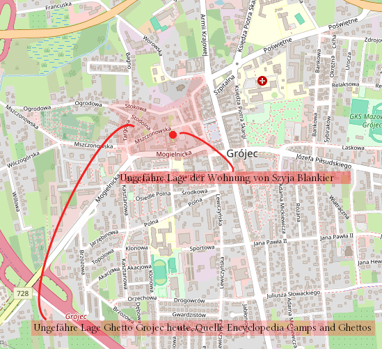 Das SPERRGEBIET GROJEC wurde von deutschen Patrouillen bewacht und innerhalb dessen sorgte für Ordnung jüdische Miliz. Es wurde von Seiten der Deutschen ein Judenrat mit Bitter an der Spitze, eingesetzt, dessen Aufsicht wir unterstanden.- Als Judenabzeichen trugen wir weisse Armbinde mit blauen Davidstern.-Ich wohnte am Ringplatz 18 und Herr Blankier in der Przenowskastrasse.- Ich arbeitete bei Kanalisationsarbeiten unter Leitung polnischer Vorarbeiter währen Herr Blankier im Sonderkommanmdo der SS Zwangsarbeit leisten musste.-