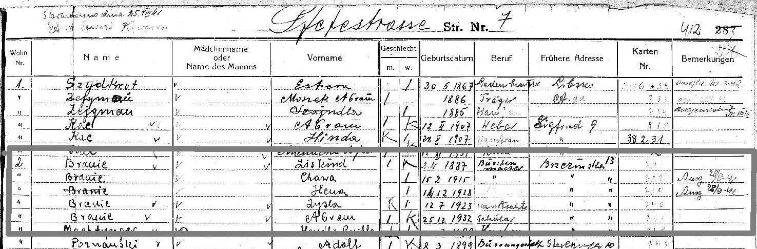 Dieser Belegungsplan muss nach dem 28.9.1942 entstanden sein, siehe die Angaben bei Chana und Henia. Bei ihren Einträgen ist vermerkt "ausgew. 28/9 42" . Die verbleibenden Mitglieder der Familie Branic waren: Zyskind, Zysla und Abram. Das Schicksal von Jankiel-Josef und Eleazar, in der Liste von 1940 noch aufgeführt, ist unbekannt.