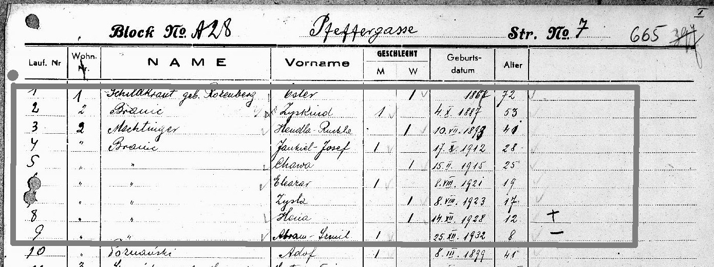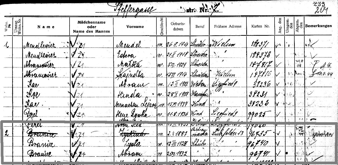 Dieser Belegungsplan muss 1940 entstanden sein, siehe die Angaben Geburtsdatum und Alter. Die sieben Mitglieder der Familie Branic waren: Zyskind, Jankiel-Josef, Chawa, Eleazar, Zysla, Henia und Abram-Szmulö